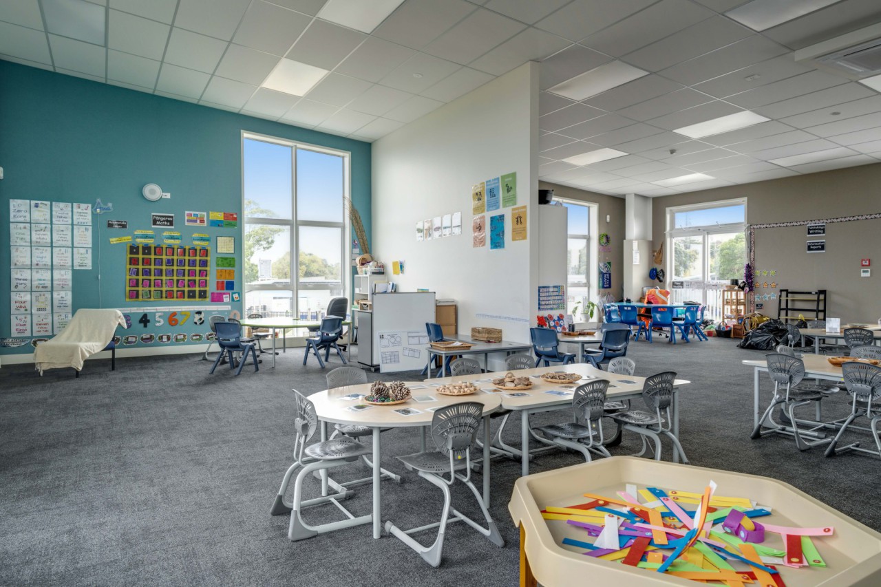 The design also reflects the school’s inclusive culture, with the adjoining special-needs unit sharing facilities. Accessible bathroom layouts were carefully planned to incorporate ceiling hoists and specialised equipment, ensuring all students can learn and play with independence and dignity.